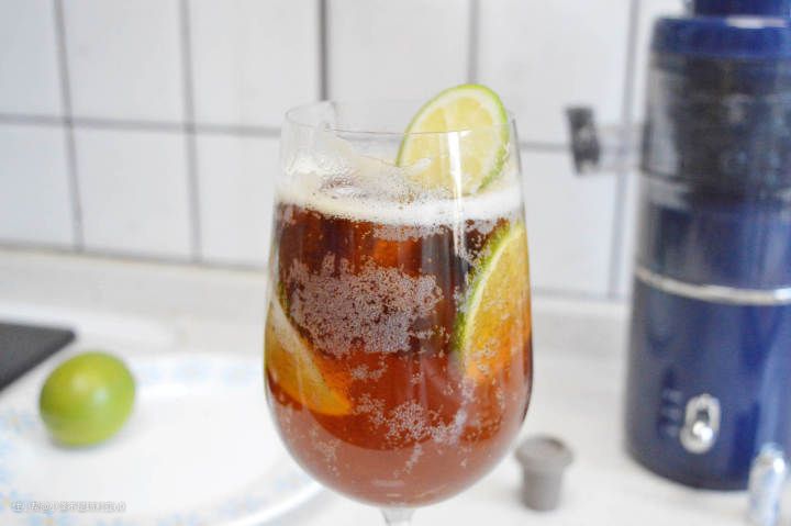 青柠汁在最底下,喝之前记得搅拌一下。我很喜欢看咖啡在青柠气泡水中满满消融的样子,杯子里的颜色好像有了活力,清新的微酸的气泡带着咖啡的香醇味道,口感真的绝了。