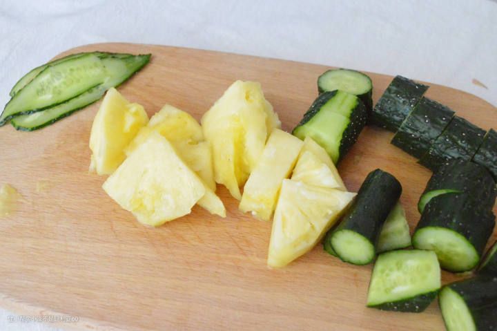 1、菠萝、黄瓜、青柠切成小块,记得留几片黄瓜片和青柠片,等下要装饰杯子~