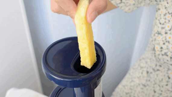 2、用原汁机把菠萝、黄瓜、青柠榨成汁。