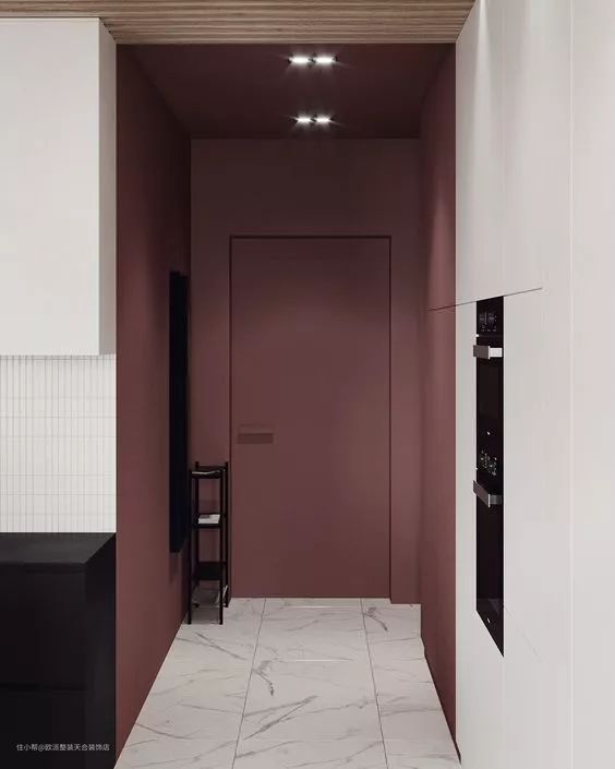 这是最普遍也是最简单的方式了,把门的颜色材质和墙面一样,基本上就可以了。再配点线条之类,让门与墙融为一体。