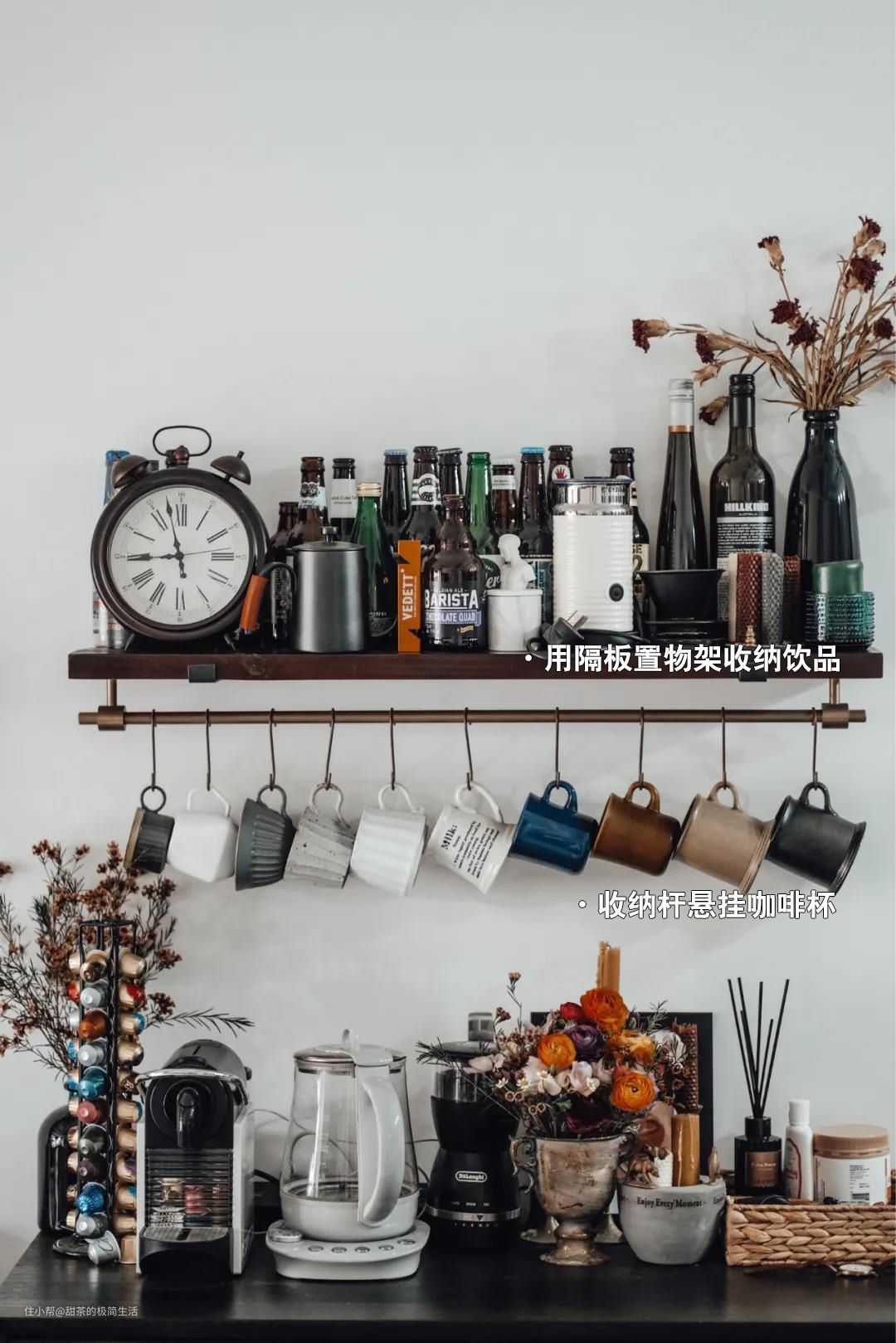 隔板置物架也是比较常见的垂直收纳工具,用来摆放一些瓶瓶罐罐也是非常方便的。比如说在餐边柜上方,我们可以做一个细长条形状的隔板架,用来摆放饮品、杯子等。