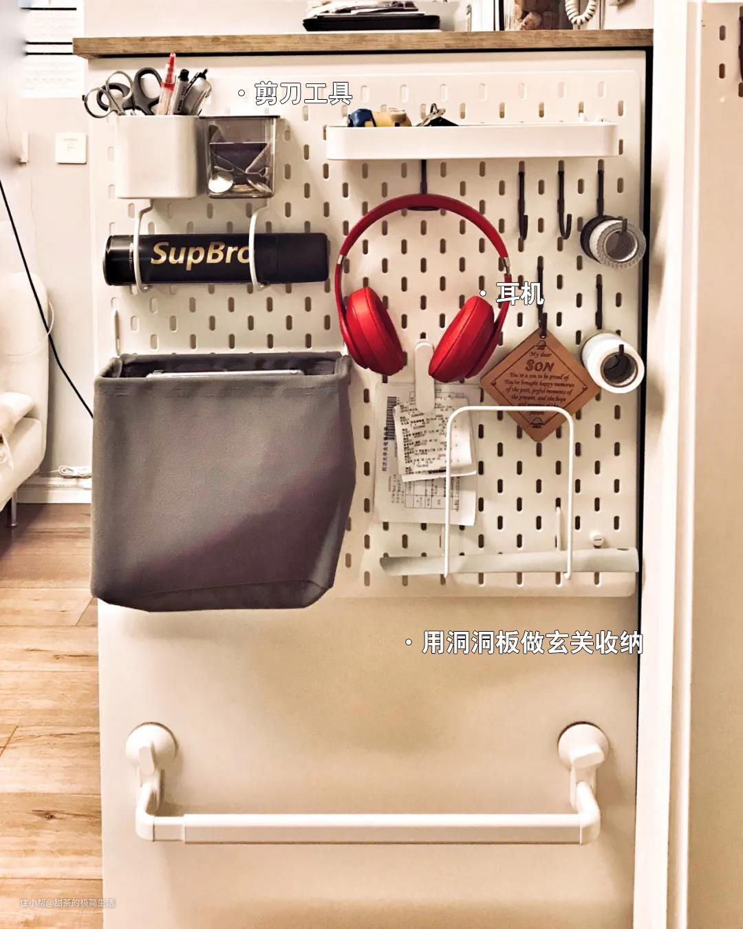 比如说,在玄关区域安装一块洞洞板,就可以很好地收纳耳机、剪刀、钥匙等等,非常实用。