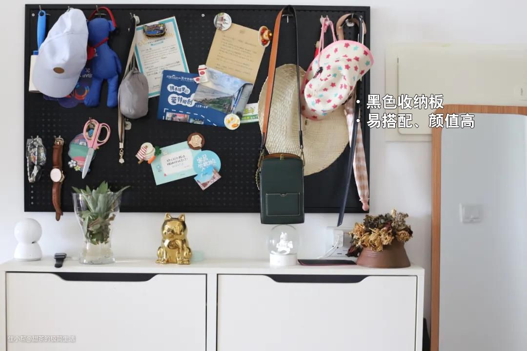 洞洞板,顾名思义,就是在一张板子上,有很多洞洞,可以在上面悬挂各种各样的物品。它简单干净,薄薄的一张板子,却能收纳各种大小不一的东西。