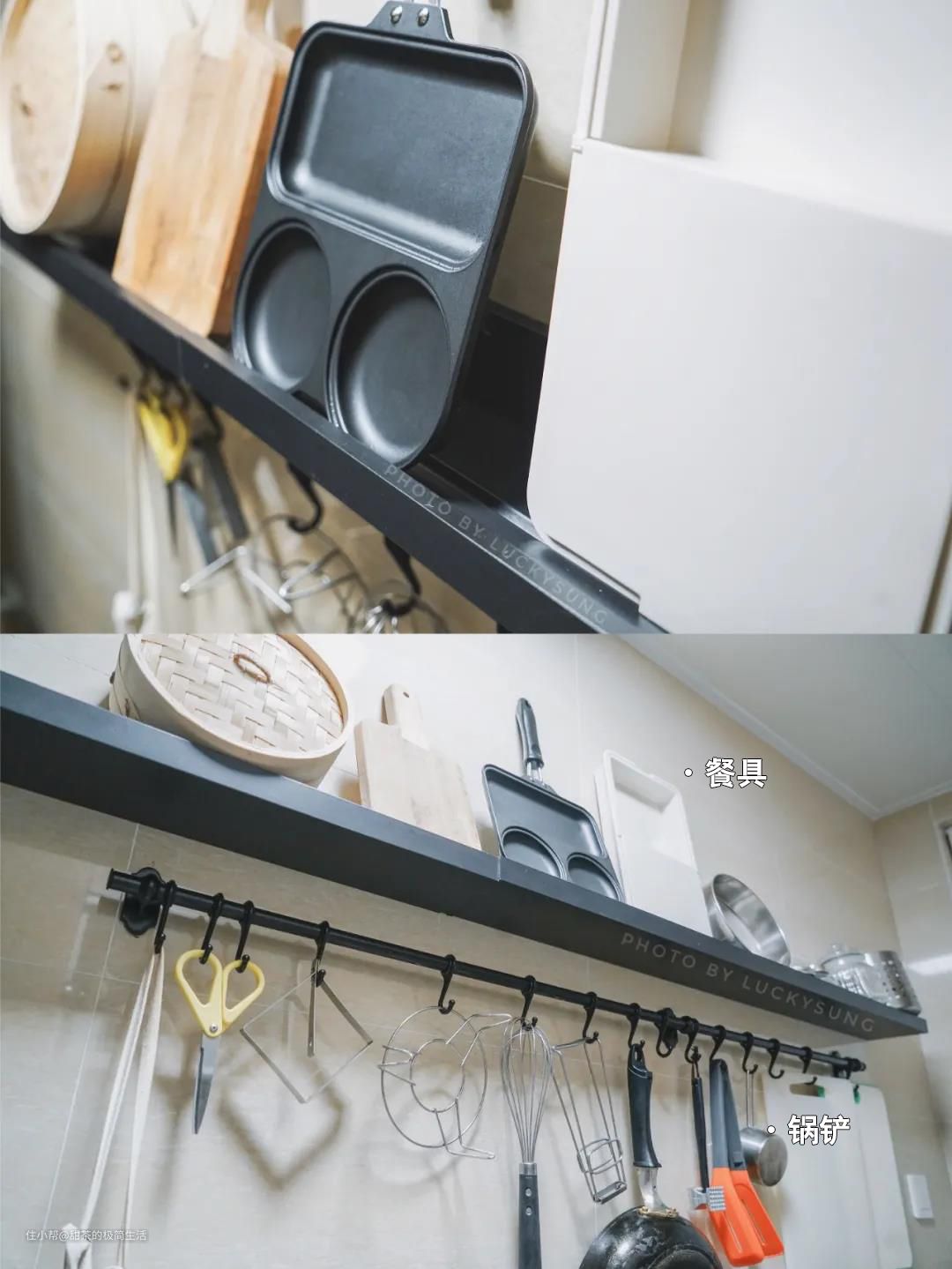 伸缩杆也适合用在厨房里,搭配S型挂钩,轻松收纳锅铲、抹布、小工具等等,看起来也非常整齐。