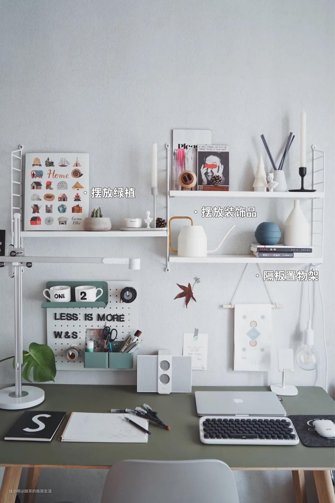 学习和办公区,也非常适合用洞洞板做收纳。把文具都挂到墙上去,可以释放桌面空间,再也不怕书桌乱糟糟的了。而且,白色的洞洞板颜值也很高,还可以起到装饰房间的作用。