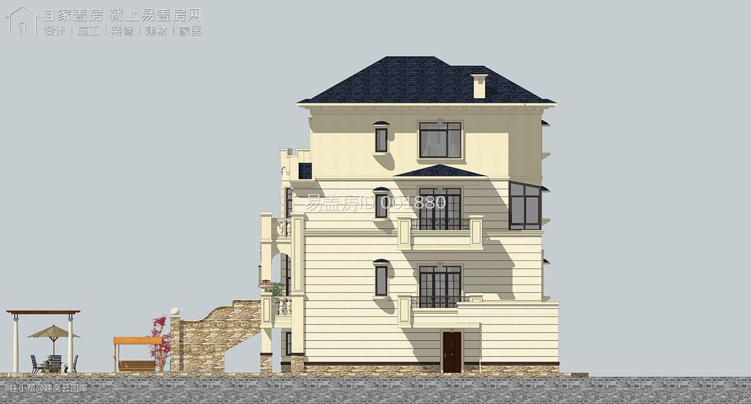 建筑整体为欧式风格,整体配色较为淡雅而优雅,设计师使用大量的米色真石漆和深色文化石,搭配线条、欧式围栏,再缀以浮雕、雕花等欧式元素装饰,立面造型精致优雅。