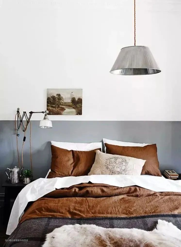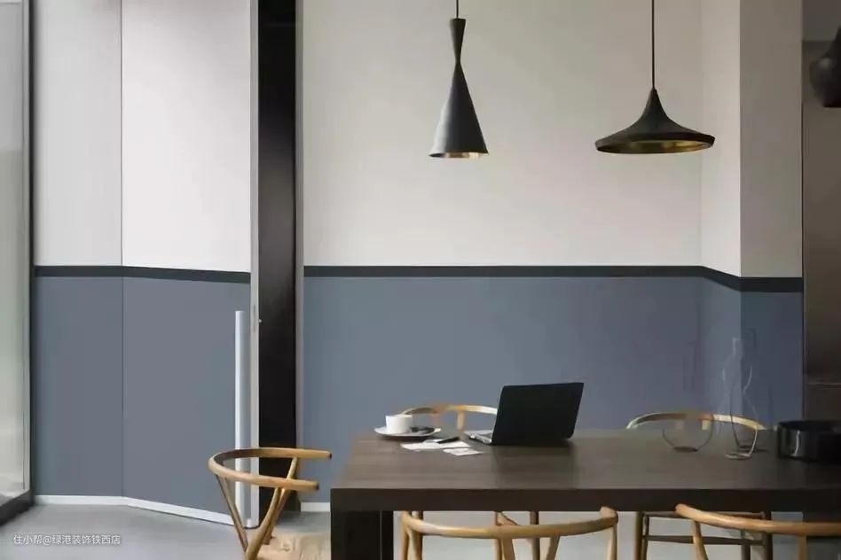 注意:双色拼接的墙面,一定要注意色彩的配比,坚持"上浅下深"的原则,否则会让空间失去平衡,显得头重脚轻。