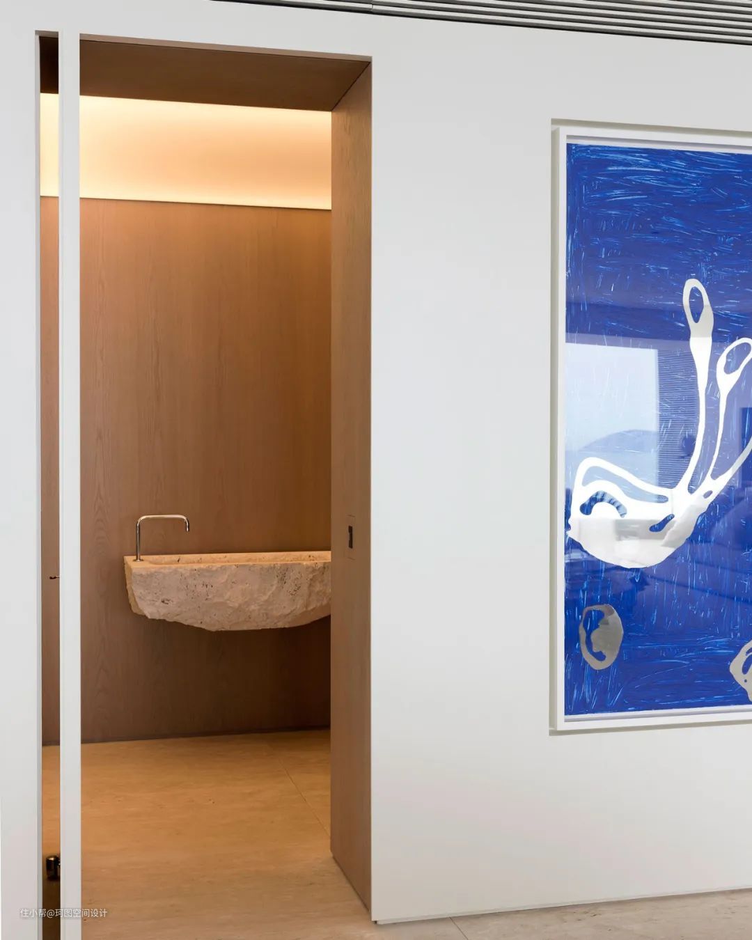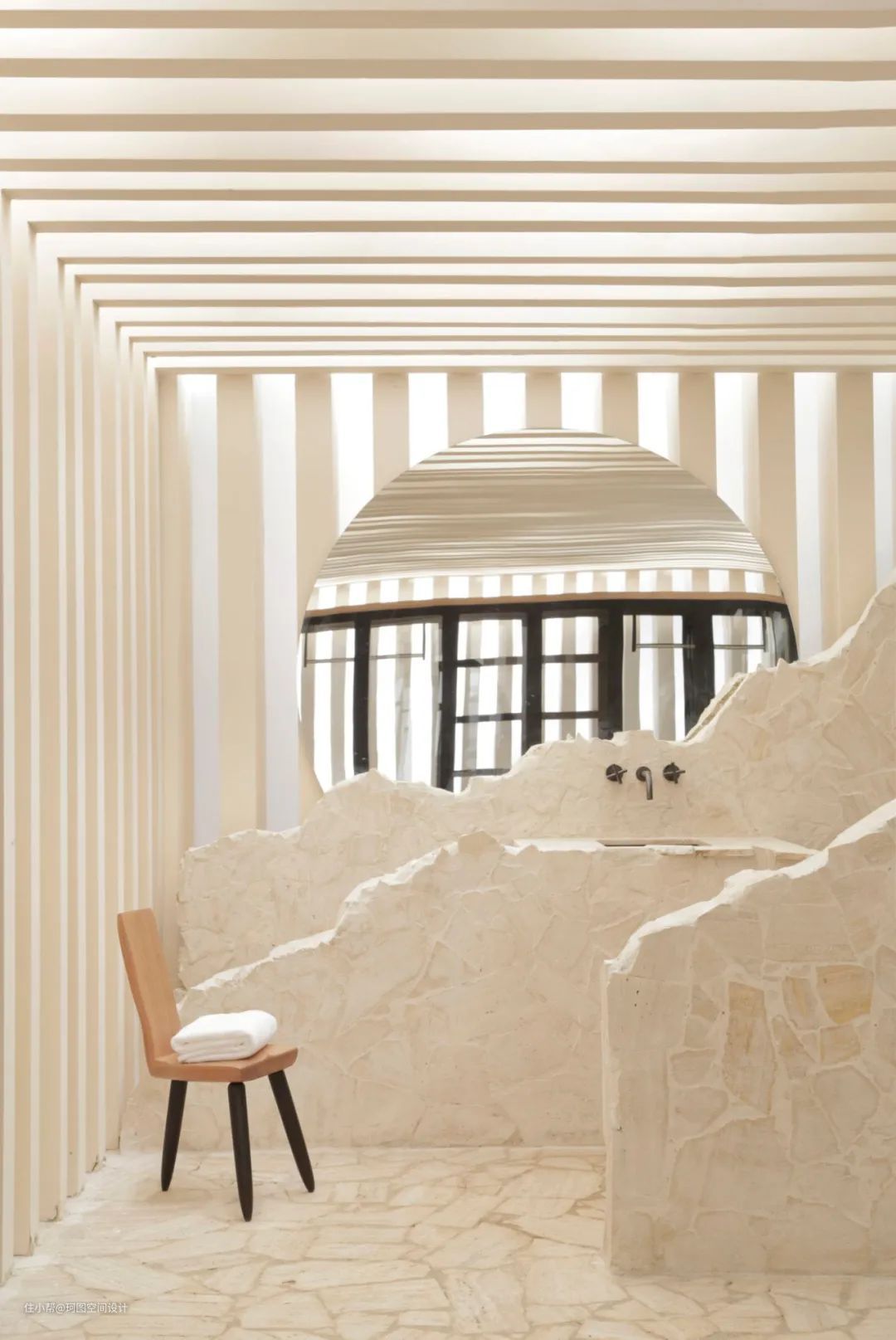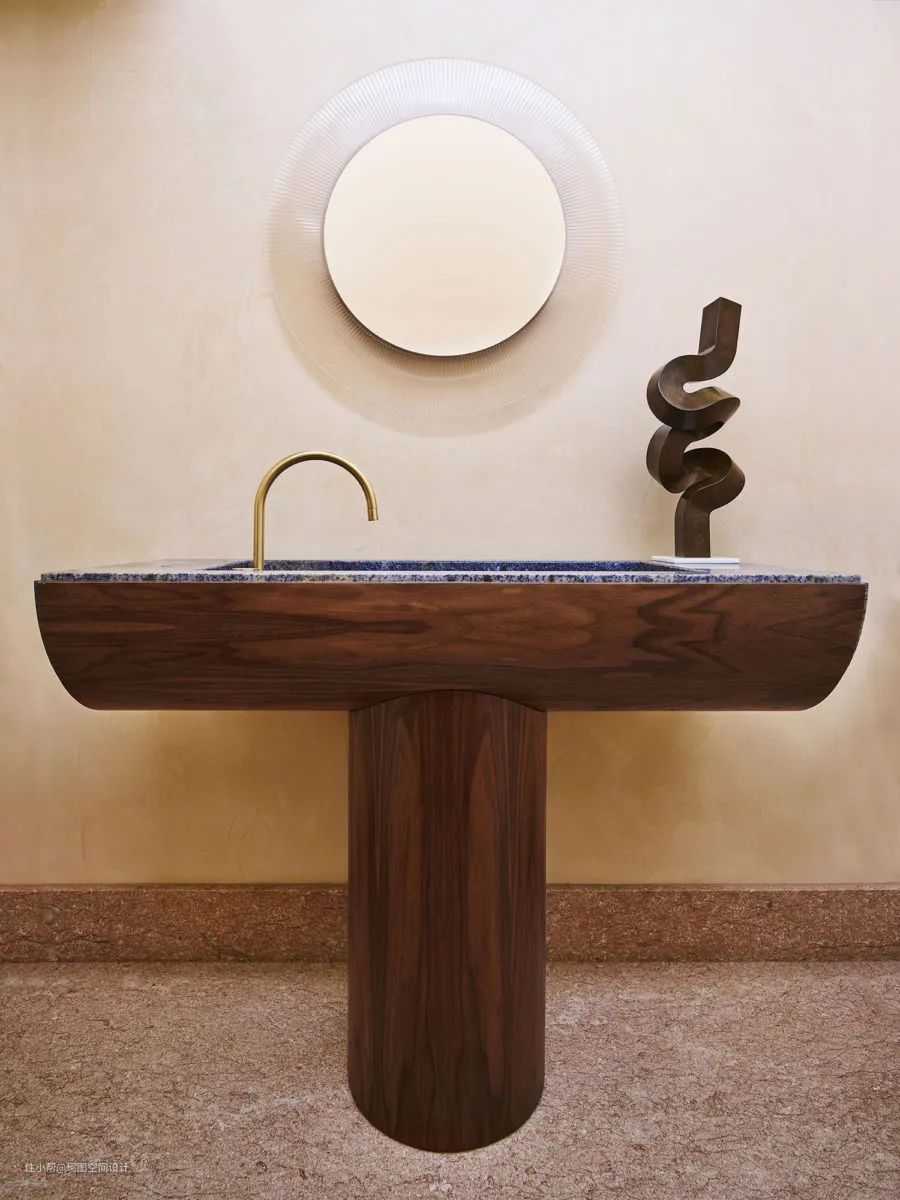 - 用岩石打造的洗手台,表面凹凸不平,看上去非常粗糙,与周围光滑的木饰面形成强烈的对比。