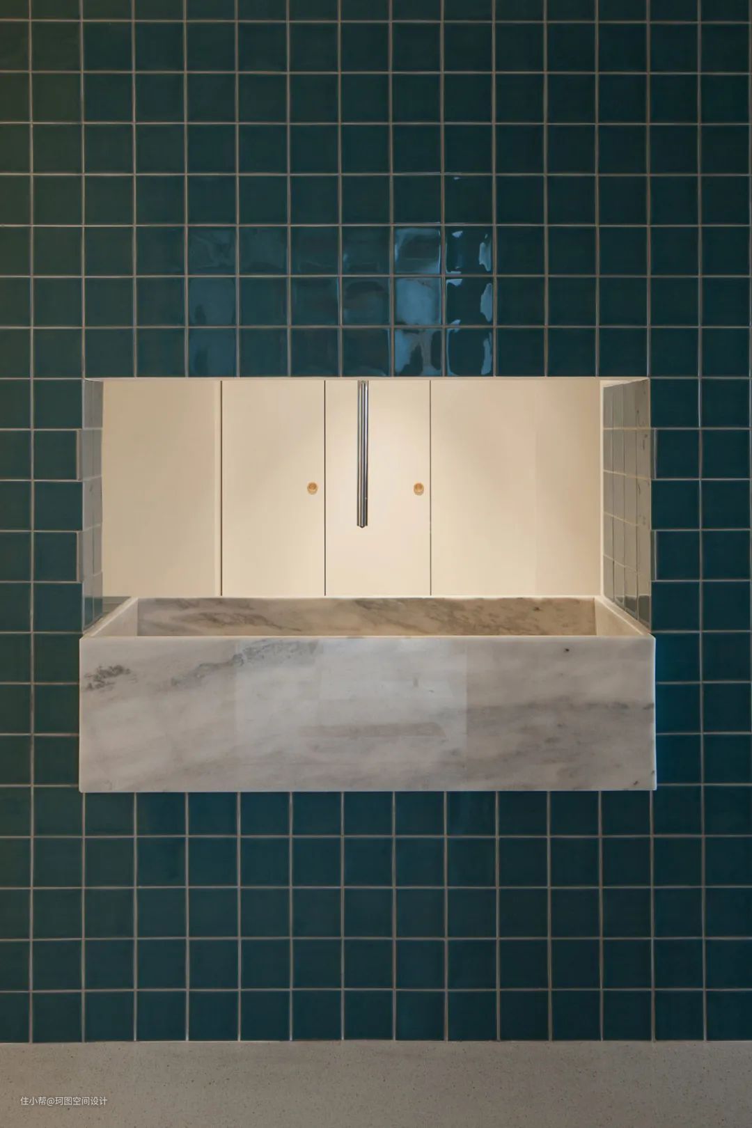 - 用墨绿色瓷砖包裹洗手盆,水龙头也是垂直在中间,非常独具一格的洗手台。