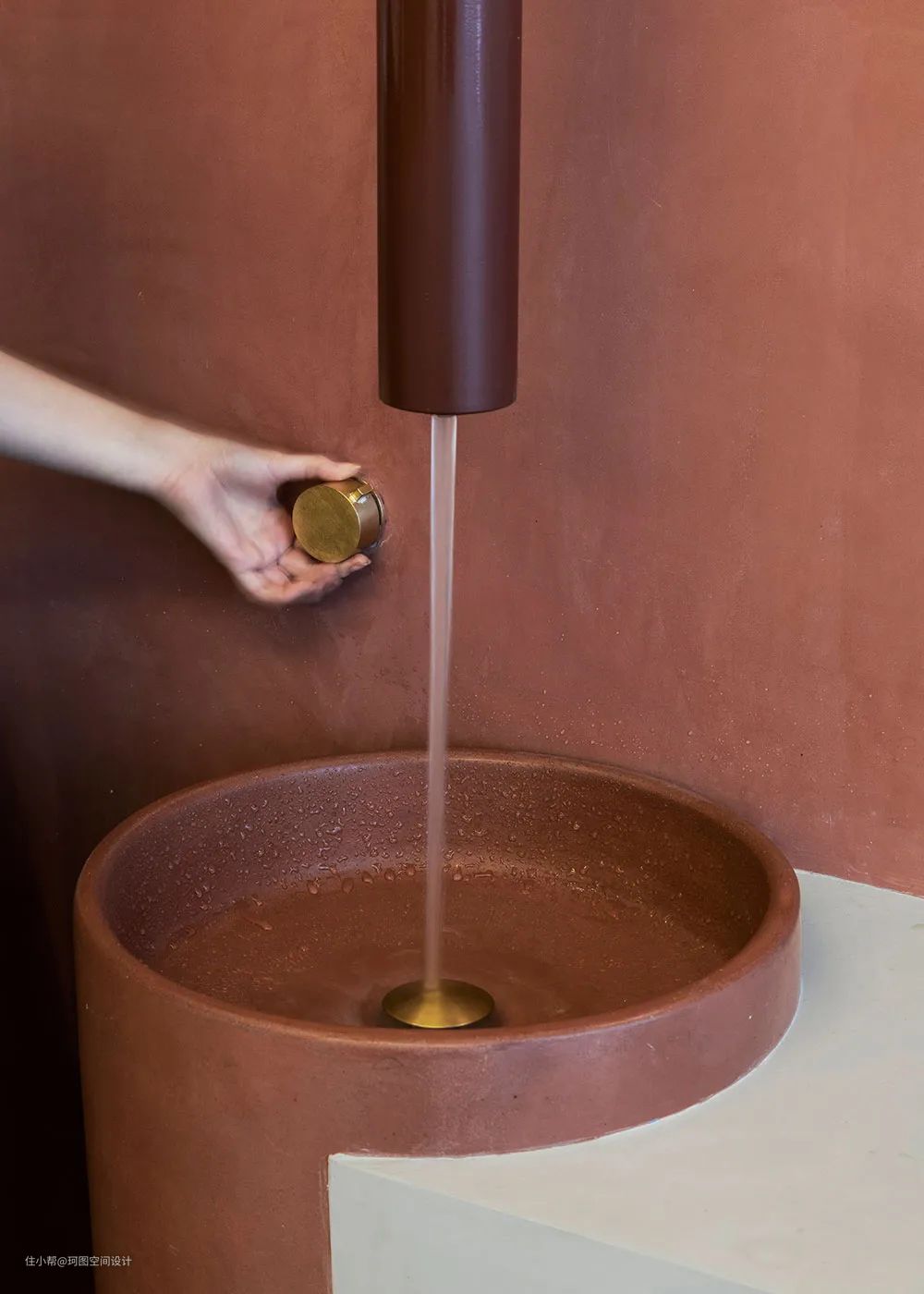 - 墙面与洗手盆以砖红色装饰,旋转按钮与垂直的水龙头让这款洗手台充满神秘感。