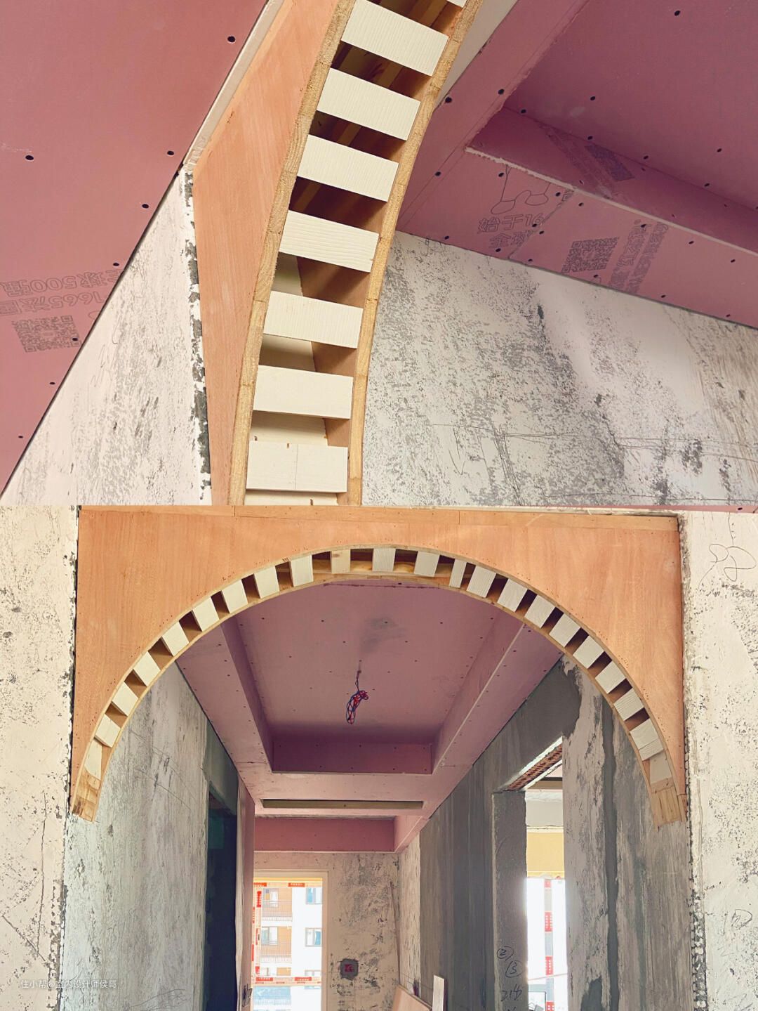3.将做好的细木工板加到门洞上方,在拱形区域用木方加固,木方间隔5cm即可。