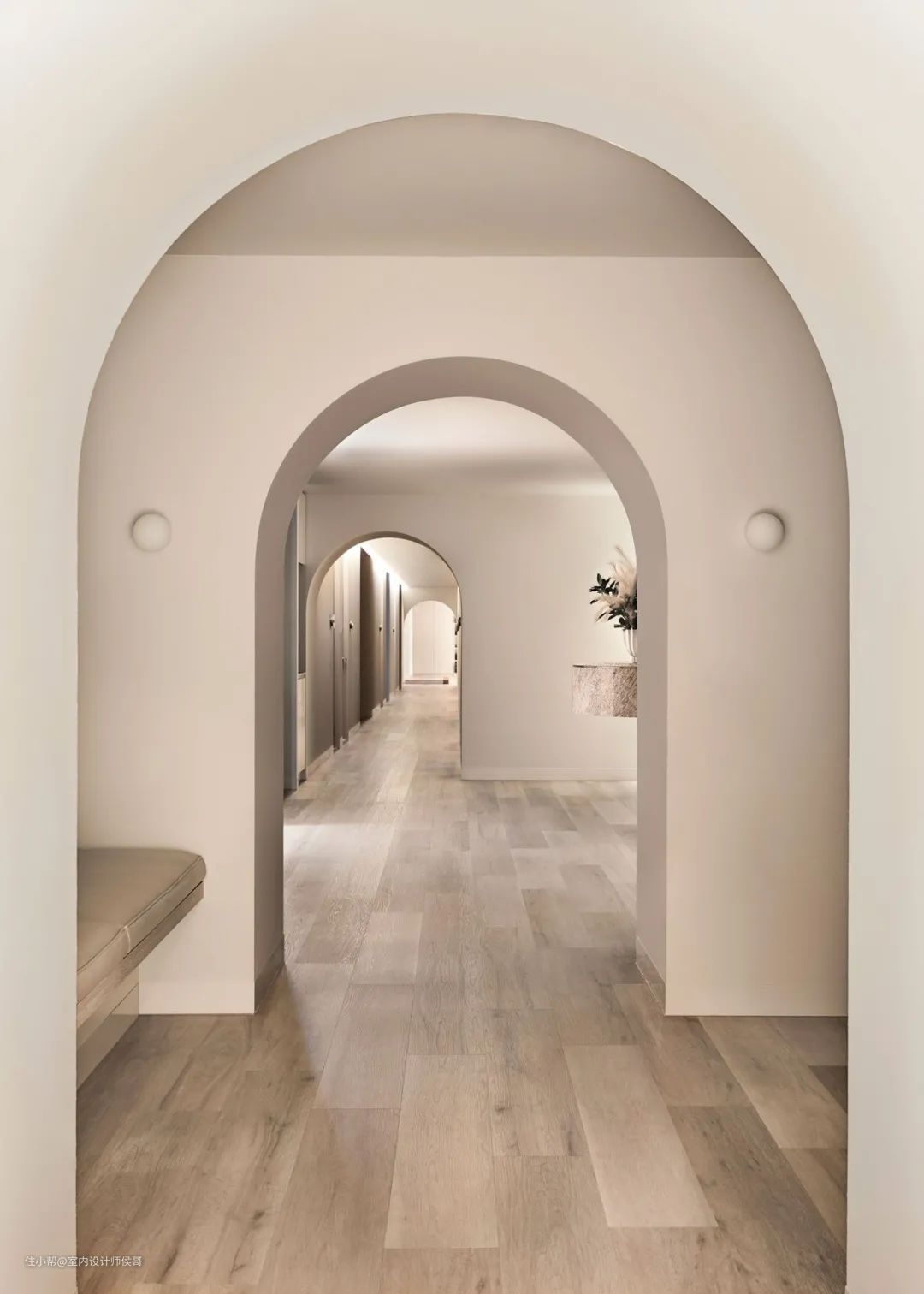 圆弧型的拱形门洞是最常被设计师运用的项目,以“型随机能”的方式,让拱形门洞美化墙面造型,同时赋予实用功能。
