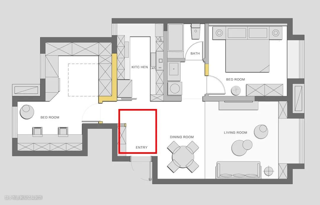 改造后,把小卧室不规则部分的墙体敲掉了,直接匀出来一点空间给厨房,正好放冰箱。
