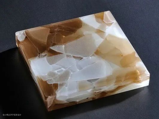 如果说半宝石是将玻璃和石材直接结合在了一起,那么,下面要介绍的这款石材,就是把薄片石材夹在玻璃中,形成的新型石材材料。
