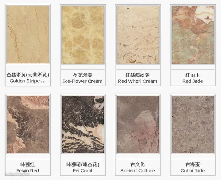 不同的项目需要不同色系和材质的大理石进行搭配,以上只是我们梳理的最常见石材类别,网上还有很多这样的石材品类资料,如下面这样的
