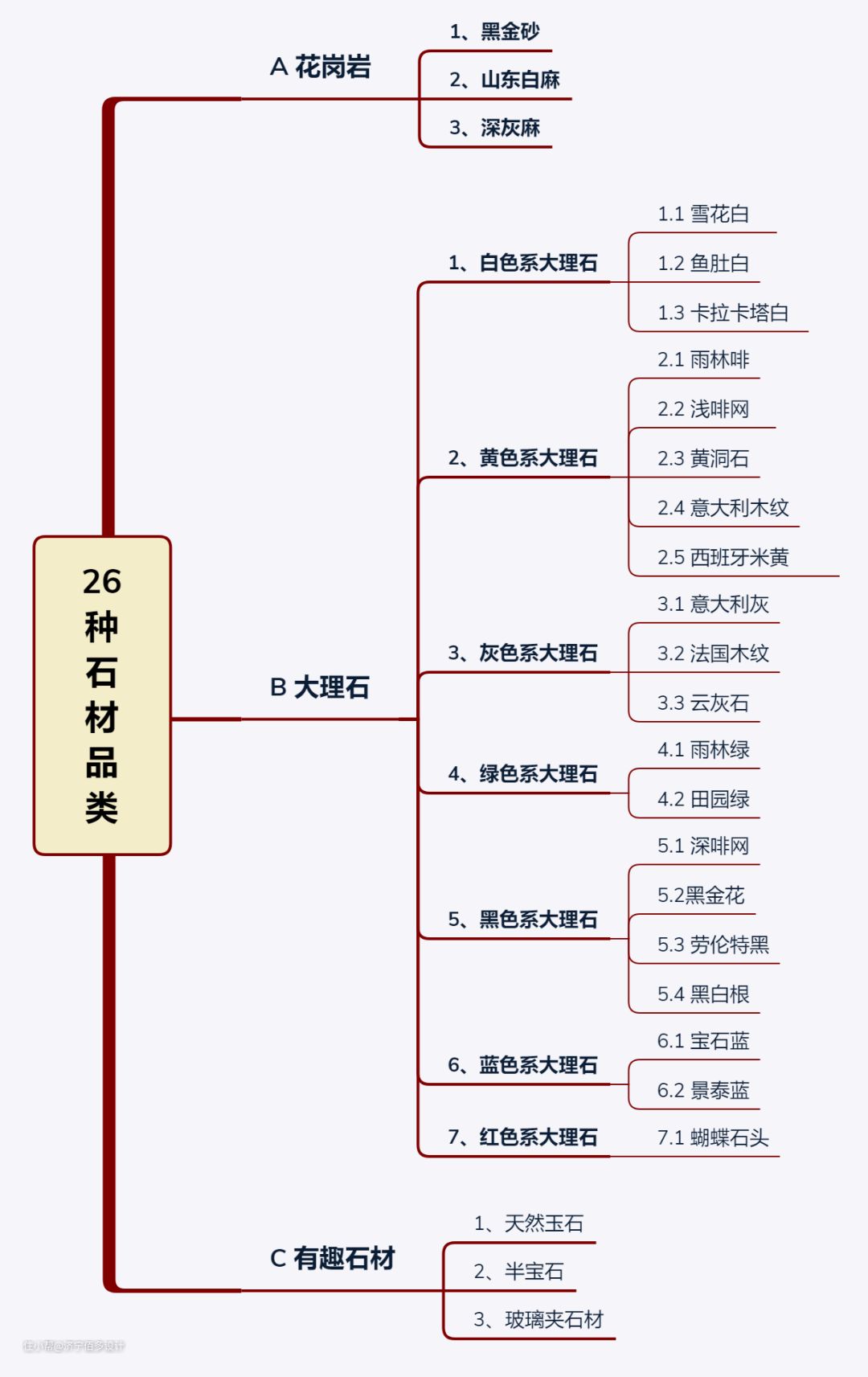 所以,面对如此众多的石材样式,我们要从最本质的石材种类进行划分。接下来,挑选26种比较常用的石材品种,进行简要说明,丰富大家对石材门类的认识,开拓自己的视野。