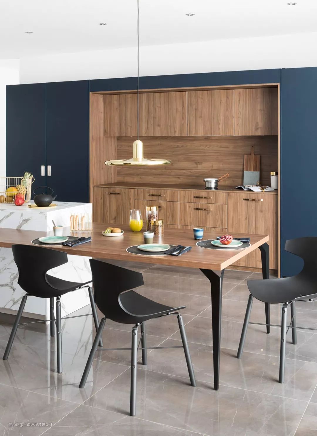当吧台下没有了橱柜和隔板后,吧台两边都可以坐人,招待更多的人,这就是餐厅和吧台一体化的设计。