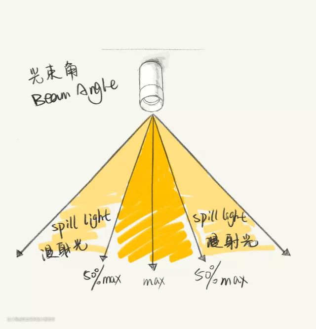 「光束角 beam angle」:从「光」上来讲,筒灯和射灯没有明显的界限,以光束角的度数来规划应用,比筒灯和射灯2个名词要更专业,也就更明确了。