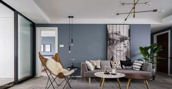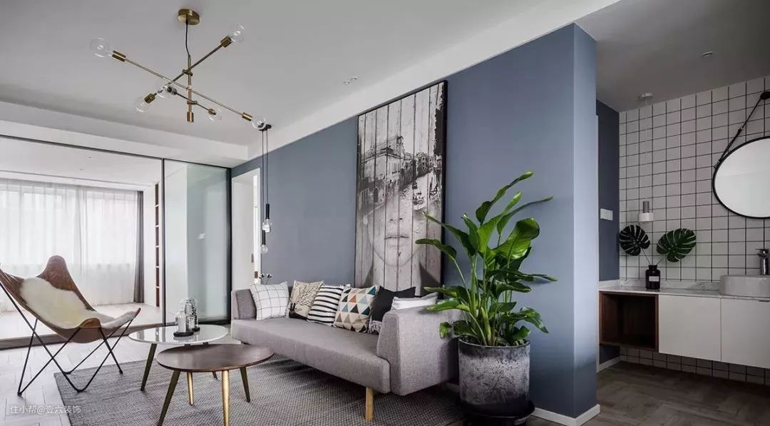 客厅的配色可以说是捕捉到了北欧的清新配色和复古做旧的怀念感,留白的屋顶,灰蓝色的背景,整体色彩比较柔和,使得区域更具有空间感和艺术效果。沙发背景采用大幅的装饰画,搭配美美的绿植,为空间添了一份的清新与文艺,简洁舒适。