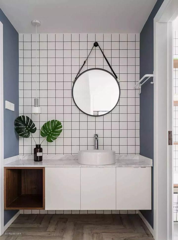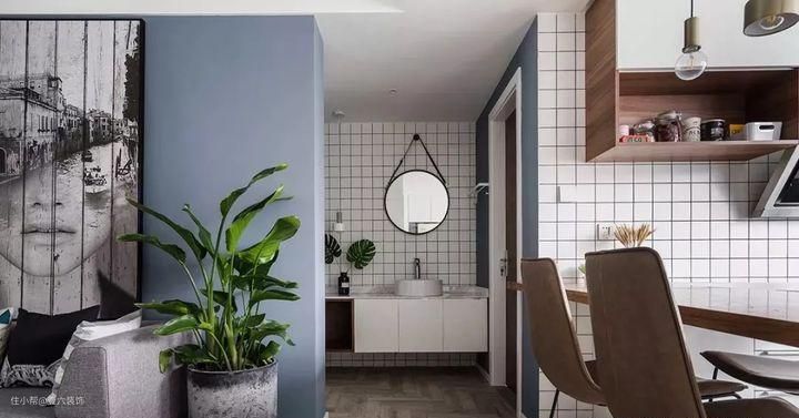 洗手台放在了进入主卧的过道处,卫浴柜做了悬空,洗手盆左侧用了吊灯做辅助光源,同时起到比例协调的作用,既美观又实用。而墙面采用与厨房一致的小白砖,使得整个空间明亮大方。