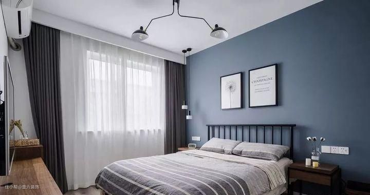 主卧的墙面颜色选用蓝加灰,有种高级感,非常耐看。棉麻床品与白色通壁衣橱搭配,将北欧风与自然舒适完美融合,既能放大空间又让整体空间的色调明亮。