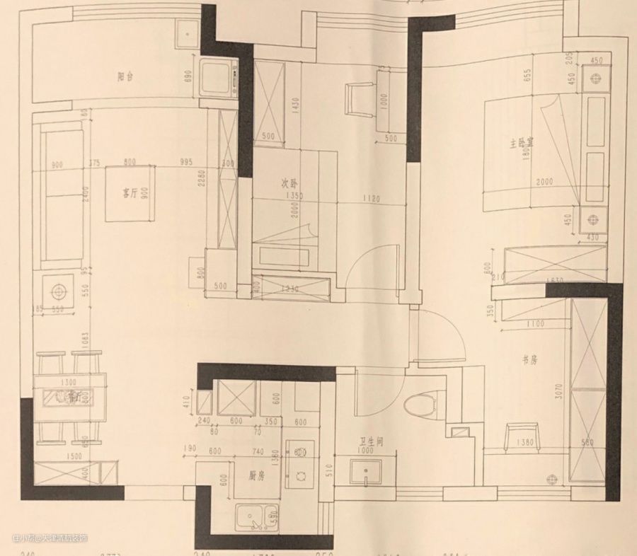 经过商量决定之后,把原来的小三房改成了小二居室,主卧背面的小房间与主卧打通,做成了衣帽间兼并书房,把门移到了走廊位置。卫生间的淋浴区往小房间移动了40公分左右,显得空间宽敞,其他的话基本没有什么变化了。能把三房改成两房,确实可以看出来,屋主想要更舒适的一种效果。