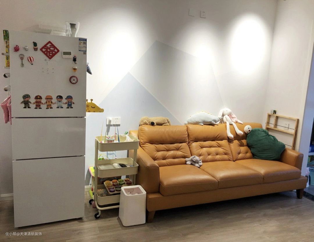 布置了黄色皮革的三人沙发,中间没布置茶几,主要是为了方便家里小孩在客厅玩耍的空间。别看现在整整齐齐,家里小孩玩耍的时候,看到就心里来气了,相信为人父母看到这一幕,都会感同身受。左侧的小推车是网购的,质量还不错,价格也便宜,值得拥有!包括旁边的小小垃圾桶,也是网购的,物美价廉啊。