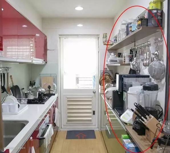 这是一个二字型厨房,墙面是最好的收纳空间,然而屋主却错误地使用了搁板,直接导致台面挤到爆,真难想象每次下厨是怎样的考验?
