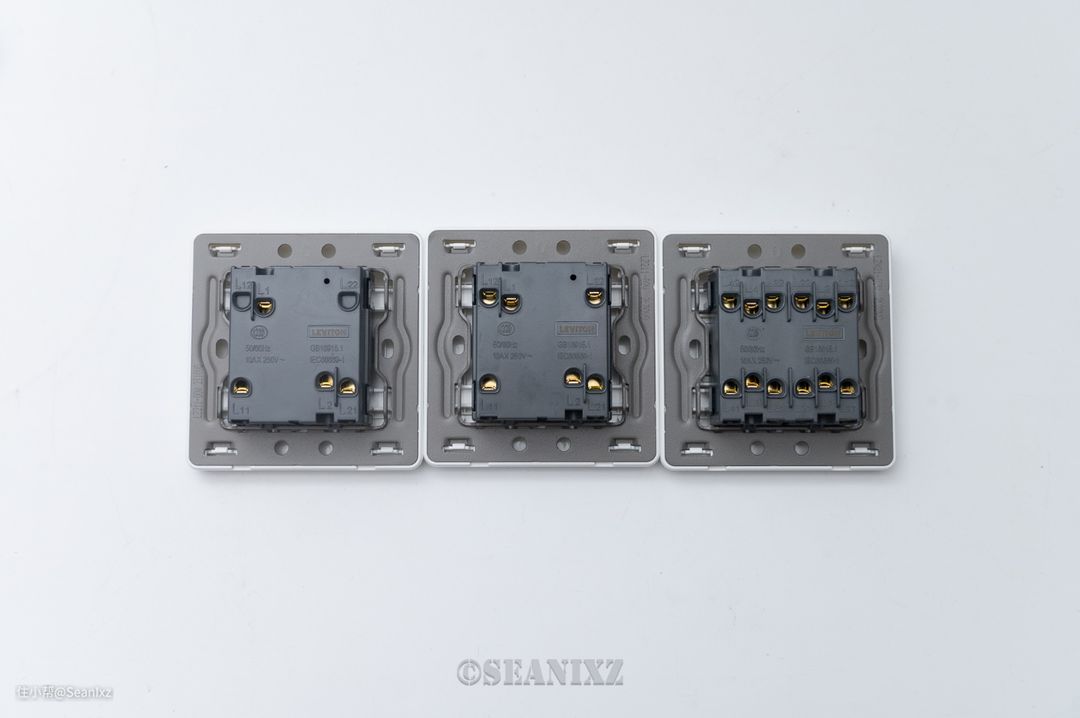 开关方面有个二开多控的配置,上图从左到右为二开单控、二开双控、二开多控,可以看到接线口的差别,双控配合多控可以实现多人从不同的房间来控制同一个设备的需求,比如我想在每个房间做个控制全房新风的开关,就可以这样用多控来实现。