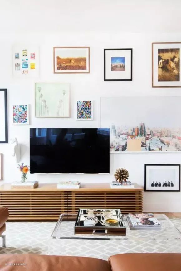 把壁挂电视所在的一面墙,做成装饰墙,把电视机当成其中一个类似挂画的物件。电视一般是黑色或者灰色的,相当于自带画框,摆的时候,要注意下疏密和色彩的搭配。