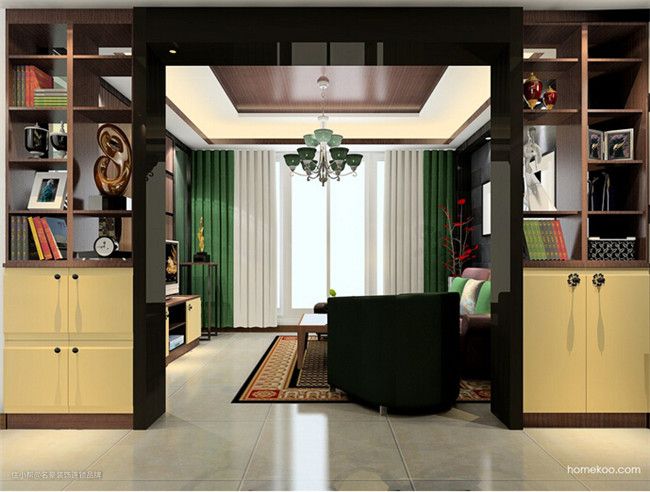 ②没有设置房门,酒柜占据左面空间,起到隔断的作用。右半边是客厅通往卧室的通道。