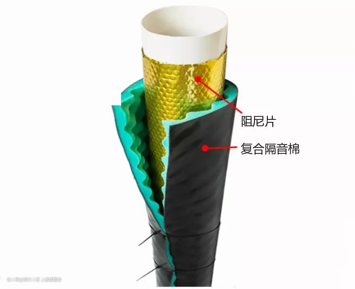 紧贴管道的菱形漫反射阻尼片(图中金色)主要起到减震作用;外层的聚酯纤维多孔吸音棉+EVA隔音毡能吸音35分贝左右。