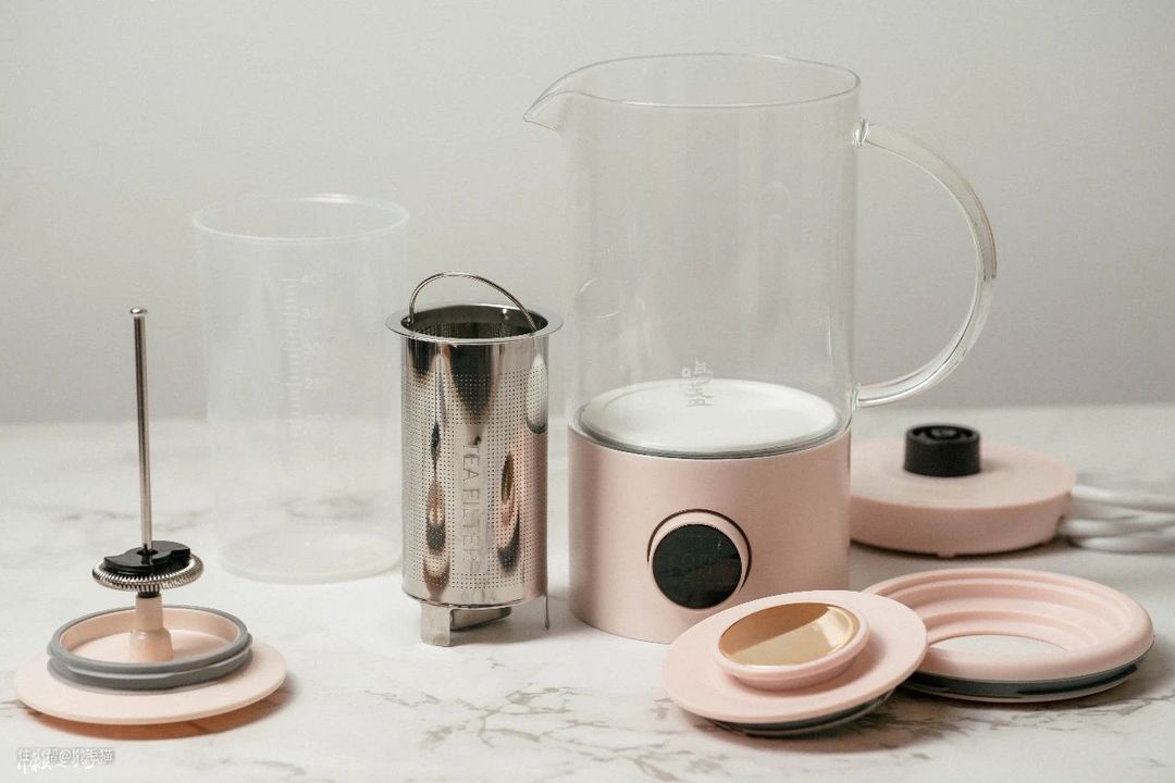 配件方面也很丰富,除了煮茶的茶漏,还有一个专门打奶盖奶泡的发泡器,还赠送了一个小量杯。