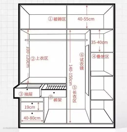 ① 挂衣区:长衣区(1.4-1.5m)、短衣区(1-1.2m)、挂裤区(0.8-1m);