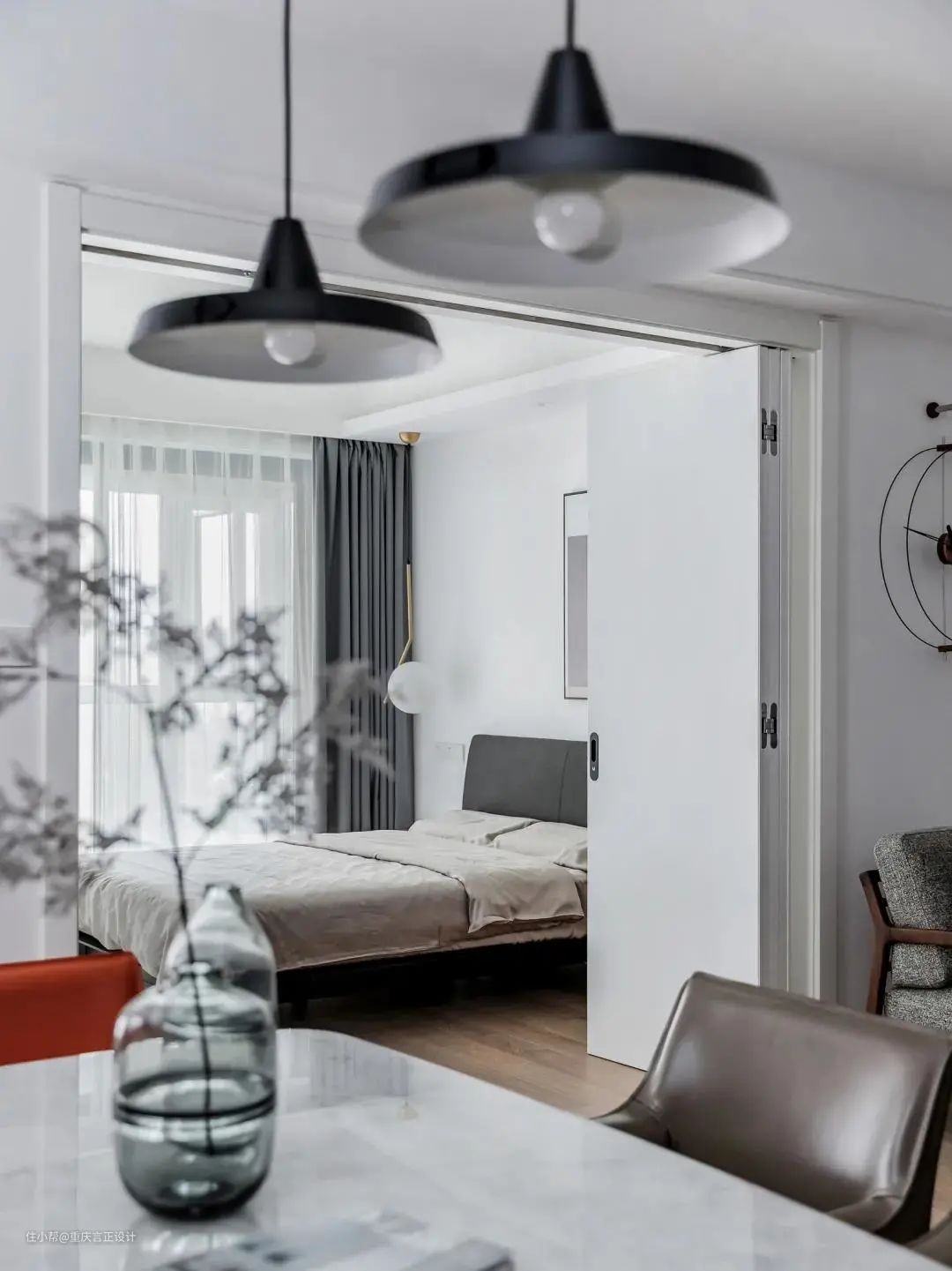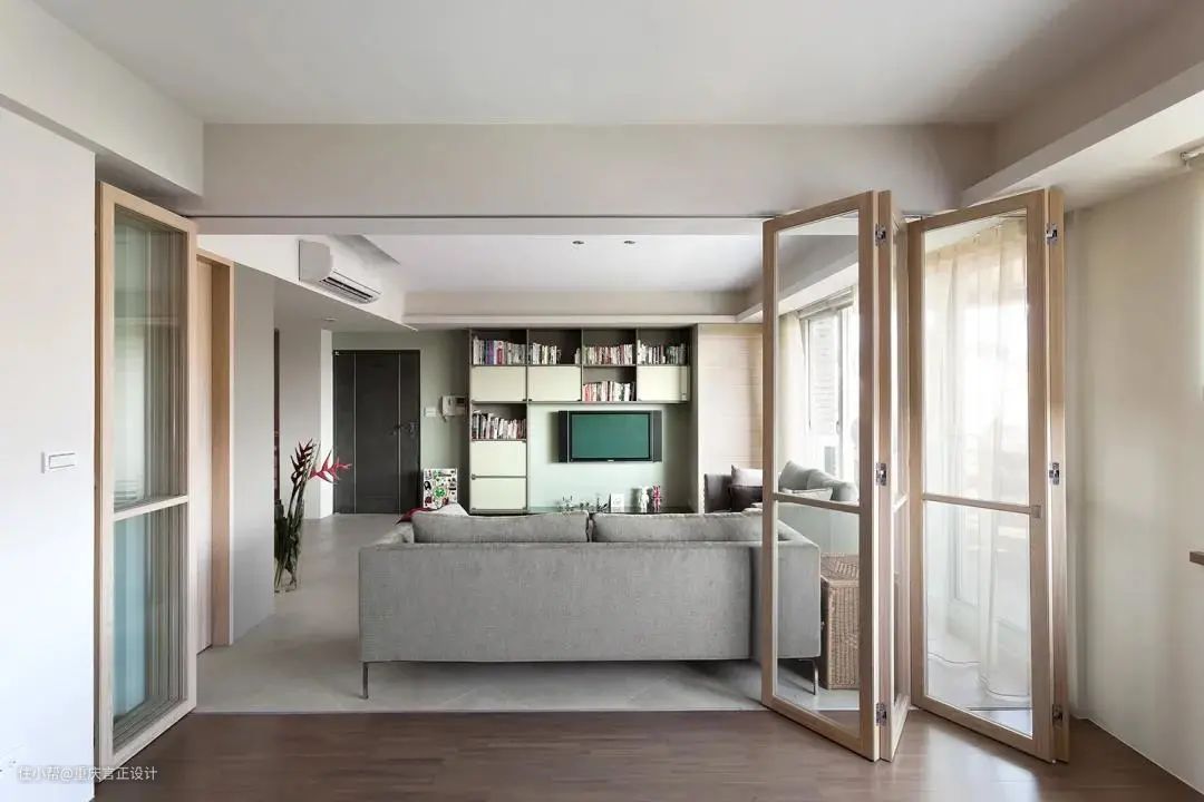 折叠门运用到空间,可以作为隔断,隔而不断,打开的时候,客厅得以延伸,视觉感更强,而关上之后,就分隔成相对对立的空间,互不打扰,空间立体感很强!