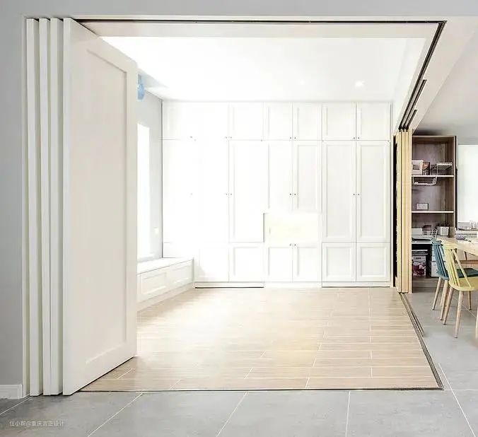 折叠门打开后可以一推到底,所占的门洞空间比较小,能最大限度的节省空间,非常适用于小户型和比较“奇葩”的户型~