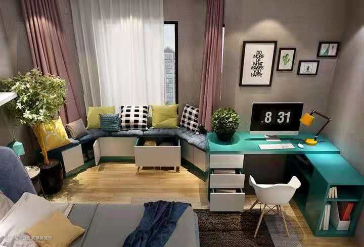 飘窗+书桌+沙发:加入抽屉柜和书桌,为有限的卧室空间加入书房功能。