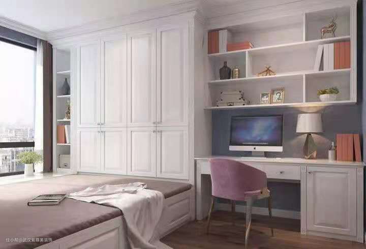 飘窗+整体柜+书桌:按户型定制的组合柜,让空间翻一倍,同时满足主人对多功能的需求。