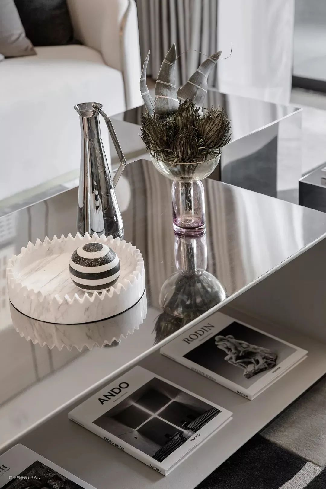 ▲米白色的皮沙发,以弧形扶手设计,线条感优雅华丽,镜面材质的茶几与边几,也使得客厅更加现代时尚高级。