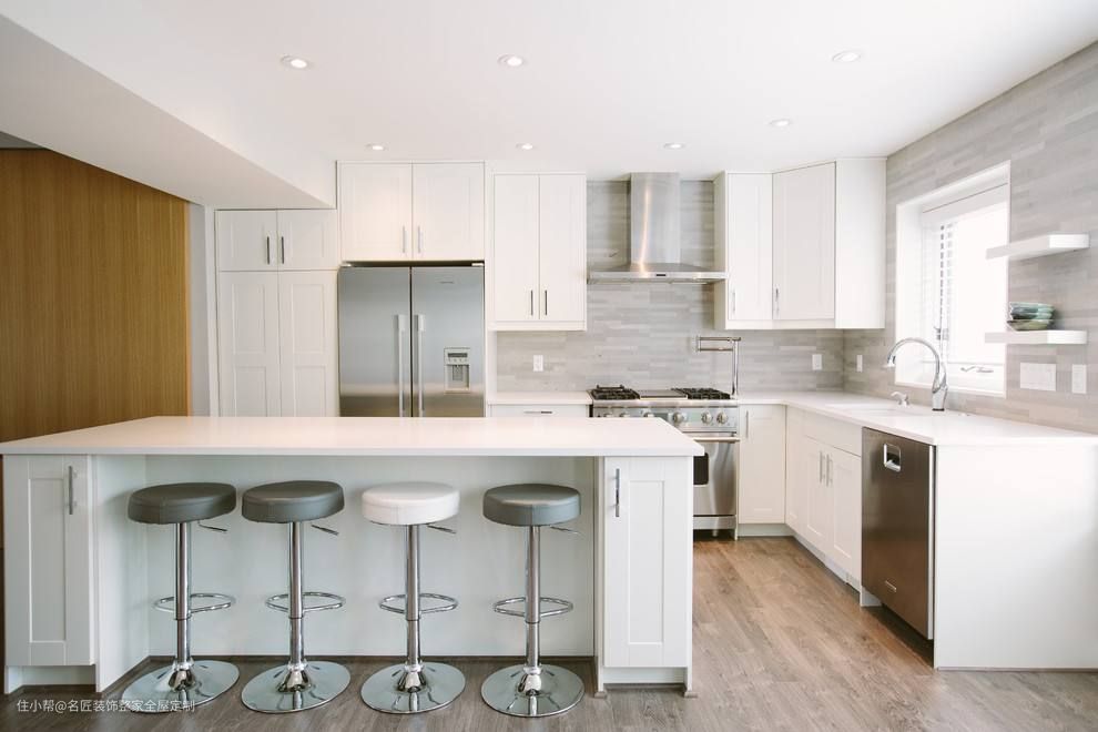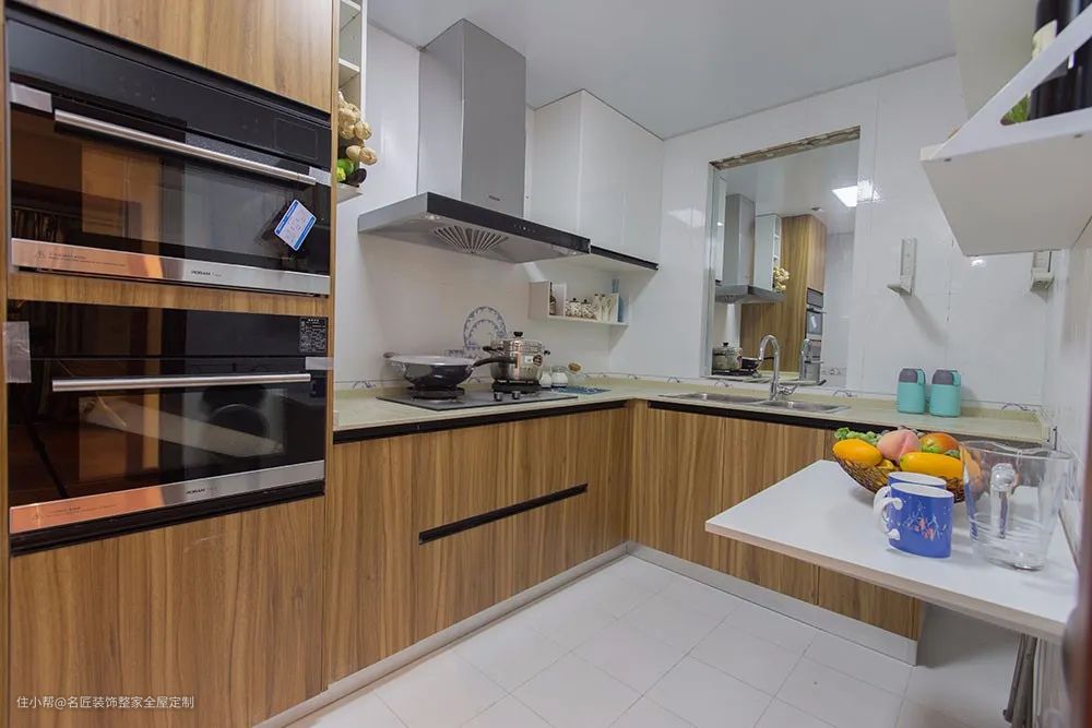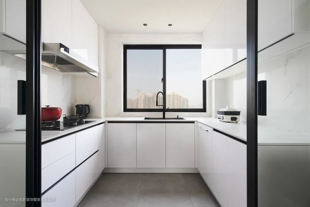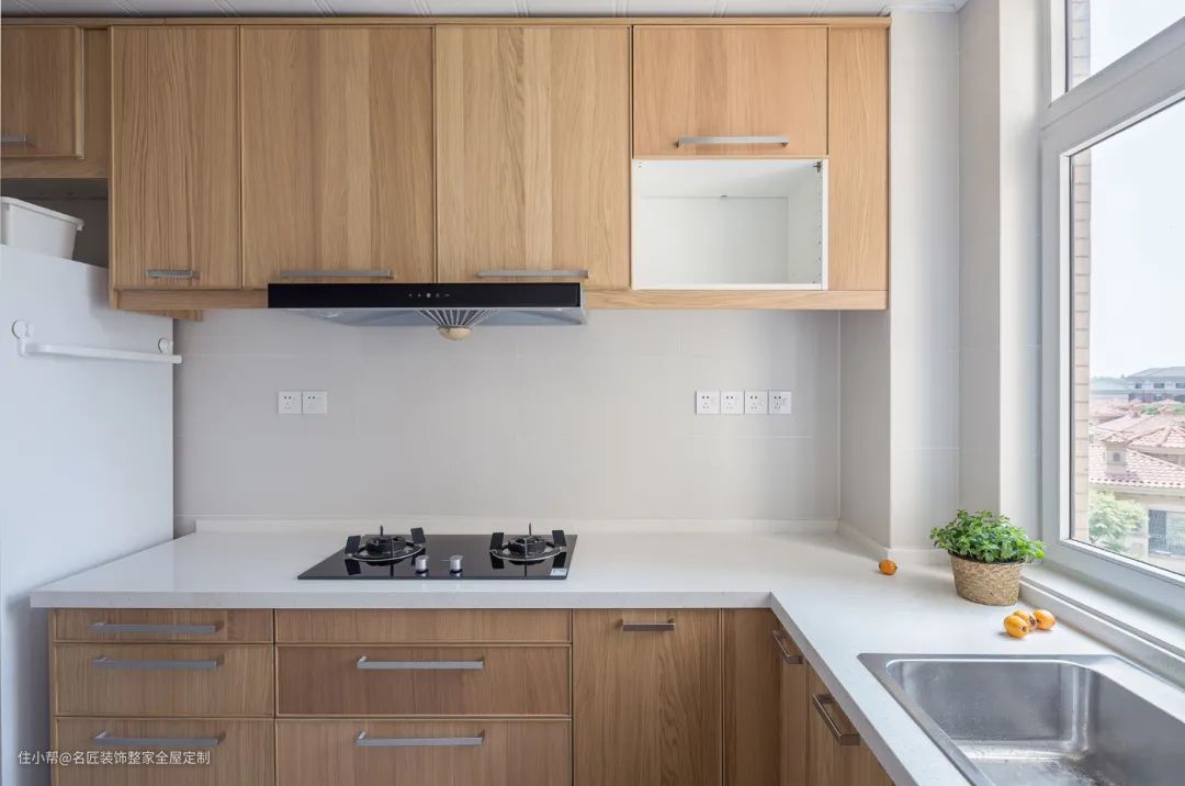 如果厨房的墙地砖和吊顶都是白色系,担心做了白色橱柜会过于寡淡的话,可以在局部稍加修饰以平衡视觉。