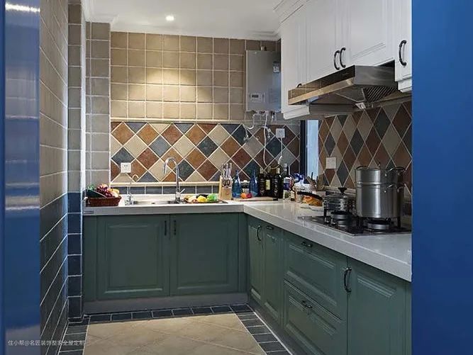 包括瓷砖、地面和墙面颜色在内,厨房用色和卧室一样最好控制在三种以内,不然很容易制造突兀感觉,给厨房“添堵”。