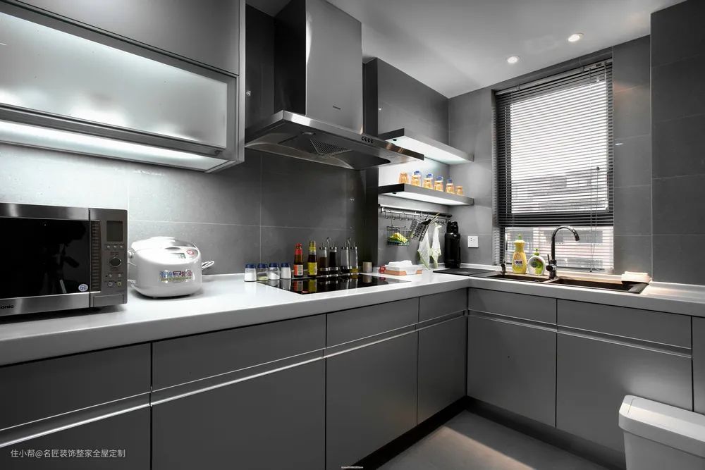 如果您家是现代简约风格,那么黑白灰都是不错的选择、尤其是家里打算设计一个西厨的话,灰色橱柜的设计看上去非常高级。