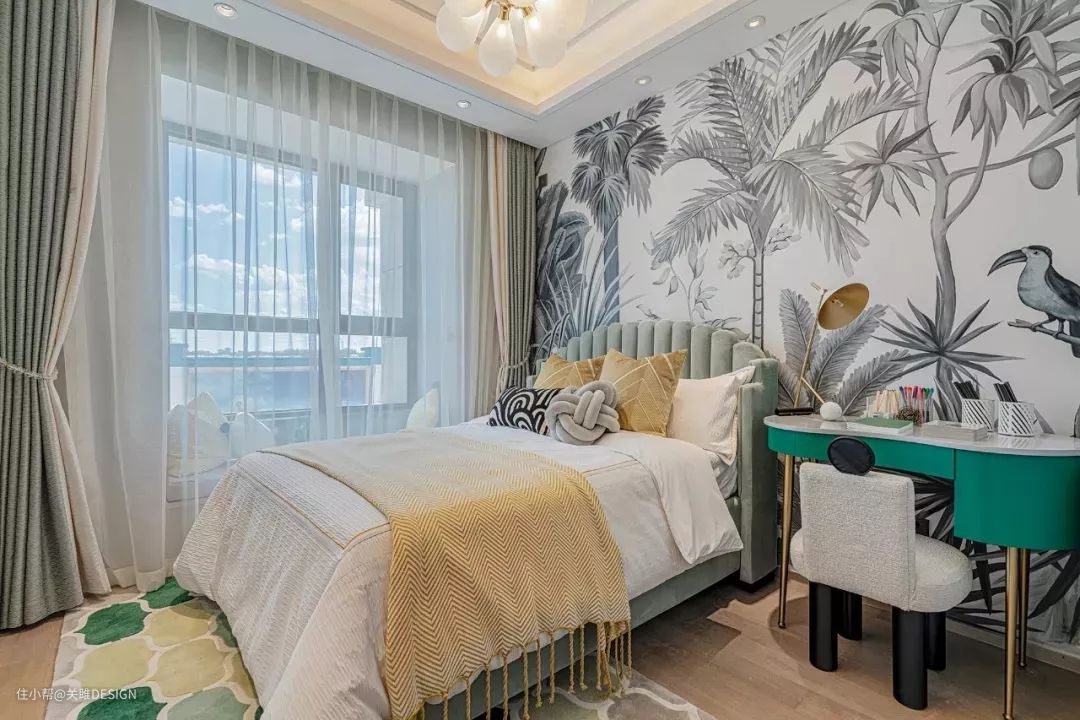 绿色的墙面,富有生命力,特别适合儿童房,如果对绿色是真爱又想要大面积的绿色,那只能是用浅一点的绿色了。墙面深浅对比不仅能给空间带来更多的层次感,也会让你的小家放大一倍。
