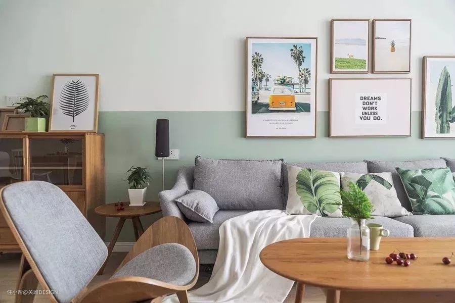 把墙一分为二,上半部分用浅色,最好和天花板保持同色,下半部分为深色。是不是看上去和天花板连作一体,有一种层高突破天际的错觉。