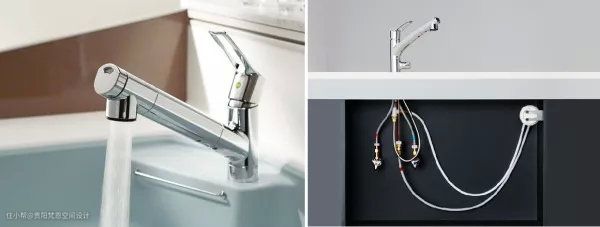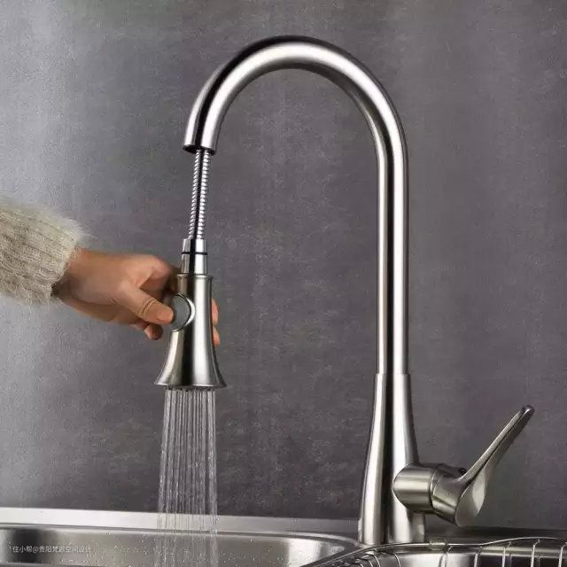 不得不说,抽拉式的龙头真的方便了大千世界的女娃娃们啊!洗头发的时候,抽拉龙头是个很好的帮手,像极了一个迷你花洒;还能实现远距离冲洗,比如冲洗马桶、墙壁等,拯救有洁癖的人群,简直不要太赞!为了方便日常使用,厨房龙头最好选择高一些的,出水嘴也要长,最好是伸展到排水口上方,而且还不能溅水。现在很多厨房里有热水管线,所以在选购时最好选双联的。为满足各种使用需要,现在大部分的厨房龙头都能实现龙头主体的左右旋转,而水嘴部分,抽拉式龙头能够将水嘴抽出,方便清洁到水槽的各个角落,其缺点在于在抽出水嘴时必须空出一只手来握水嘴。