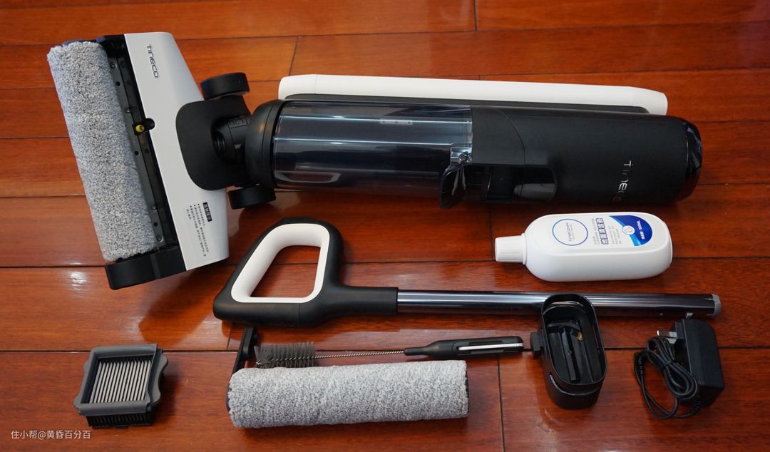 ▲这里再补充一下添可芙万2.0的配件全家福,除了机身本体与手柄之外,还有备用的滚刷,备用的HEPA滤网,充电器、滚筒架、刷污水桶的刷子以及因为体积问题没有入镜的自清洗底座。