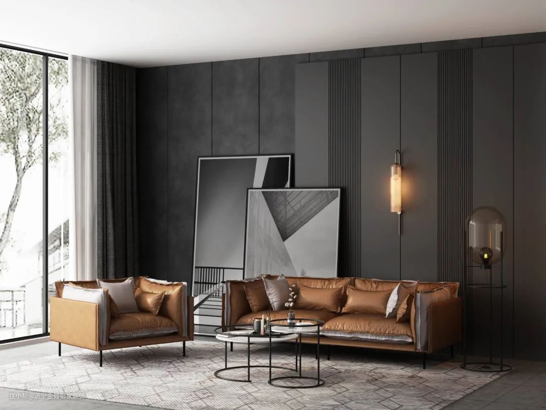 △黑色布纹墙面,搭配暗灰色地板,低调内敛,经典意式轻奢感扑面而来。