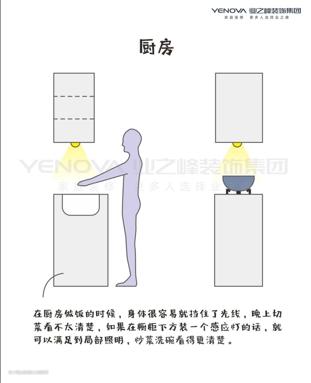 厨房的灯具一般比较单一,人在台面操作的时候,顶上的灯光刚好照在我们头顶和后背,这时候切菜挑菜老是看不清楚。在吊柜上安装一条灯带,就可以完美的解决这个问题。