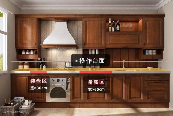 ⑤台面的尺寸划分:沥水区>30cm,备餐区>60cm,装盘区>30cm。