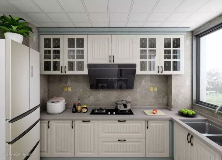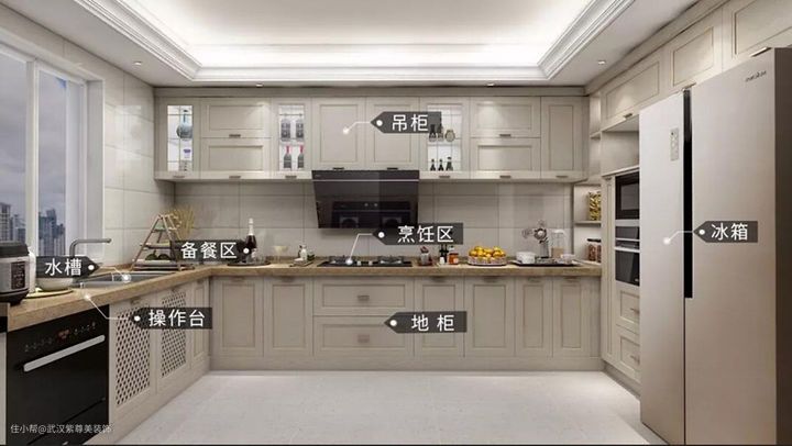 按照厨房动线洗、切、炒,规划出洗涤区、备餐区、烹饪区、出菜区,包括操作台、地柜、吊柜、冰箱位置、水槽、备餐区、烹饪区的尺寸规划,规划好布局,以达成一气呵成的厨房装修布局。